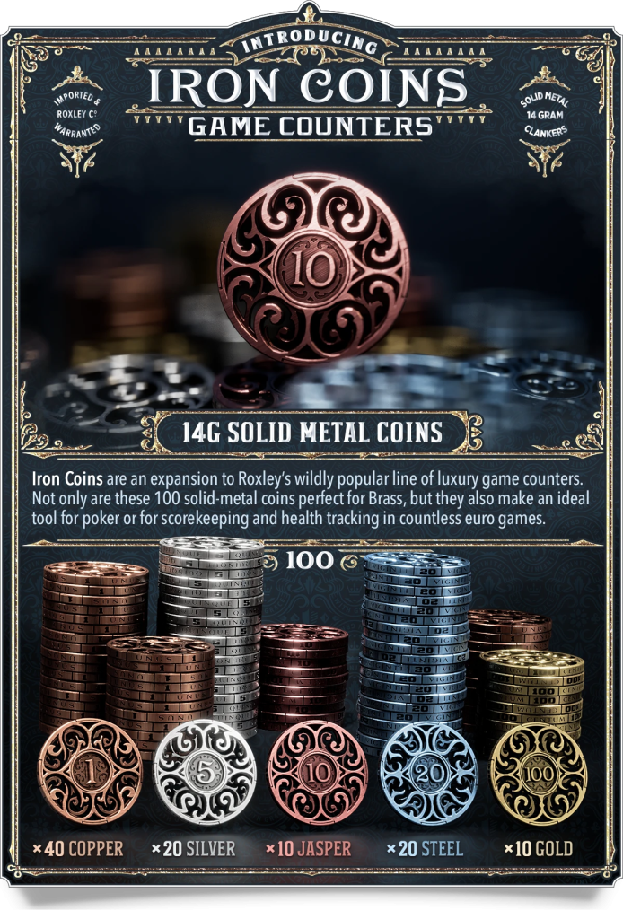 Roxley Games olisi vihdoin tarjoamassa metallisia versiota Iron Clays -pokerimerkeistään osana Brass: Pittsburgh -kampanjaansa. Voi itku. En tiedä mitä nämä maksavat, mutta nämä on kyllä pakko saada. Aikas monta vuotta olen etsinyt täydellisiä metallikolikoita muodostaakseni pelivaluutta-pankin. Semmosen kätevän moneen peliin rahaksi tai voittopisteiksi kelpaavan yleiskäyttöisen lokeron täynnä hypisteltäviä metallisia rahoja tai rahoiksi kelpaavia merkkejä. Projektin osalta päätin jo kauan aikaa sitten, että en tee kompromisseja ja hankin vain sellaiset, jotka kaikilla tavoilla miellyttävät minua. Etsin kauan ja hartaasti, selasin varmaan kaikki netin vaihtoehdot lävitse sata kertaa ja olin jo luovuttanut projektin suhteen. Sitten nämä ilmestyivät osaksi kamppista: